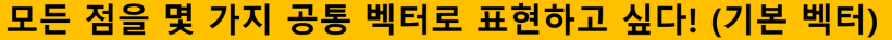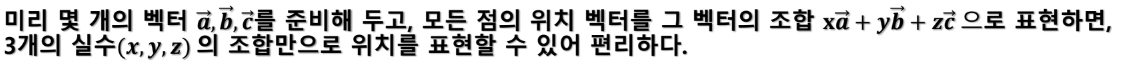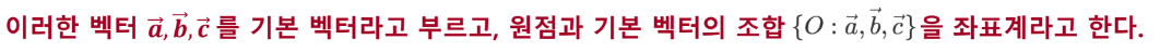 - 미리 몇 개의 벡터 𝒂 -> , 𝒃 -> , c -> 를 준비해 두고, 모든 점의 위치 벡터를 그 벡터의 조합 xa+yb+zc 으로 표현하면