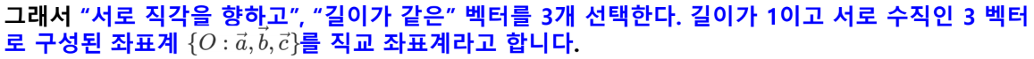 - 원점과 기본 벡터의 조합 {O : a-> , b-> , c->} 를 좌표계라고 한다.