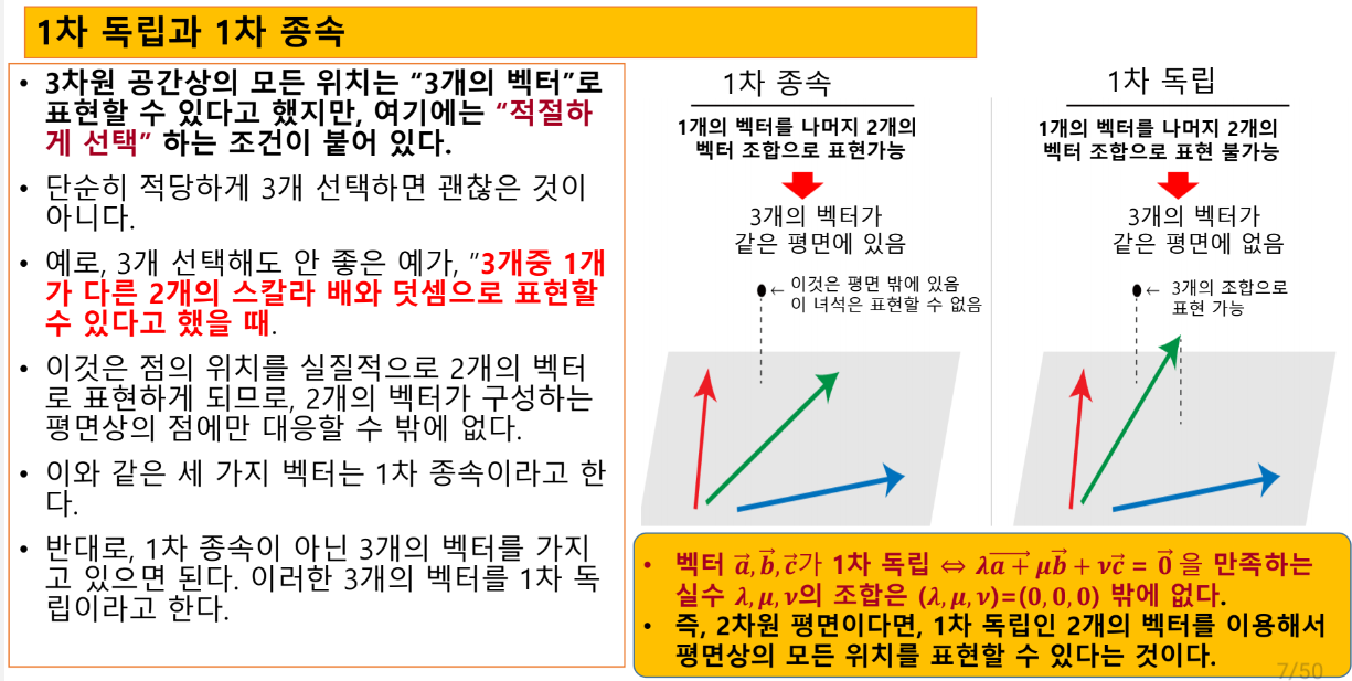 - 1개의 벡터를 나머지 2개의 벡터 조합으로 표현 불가능