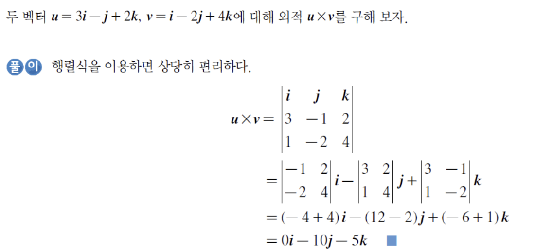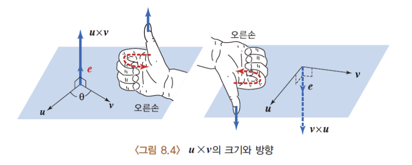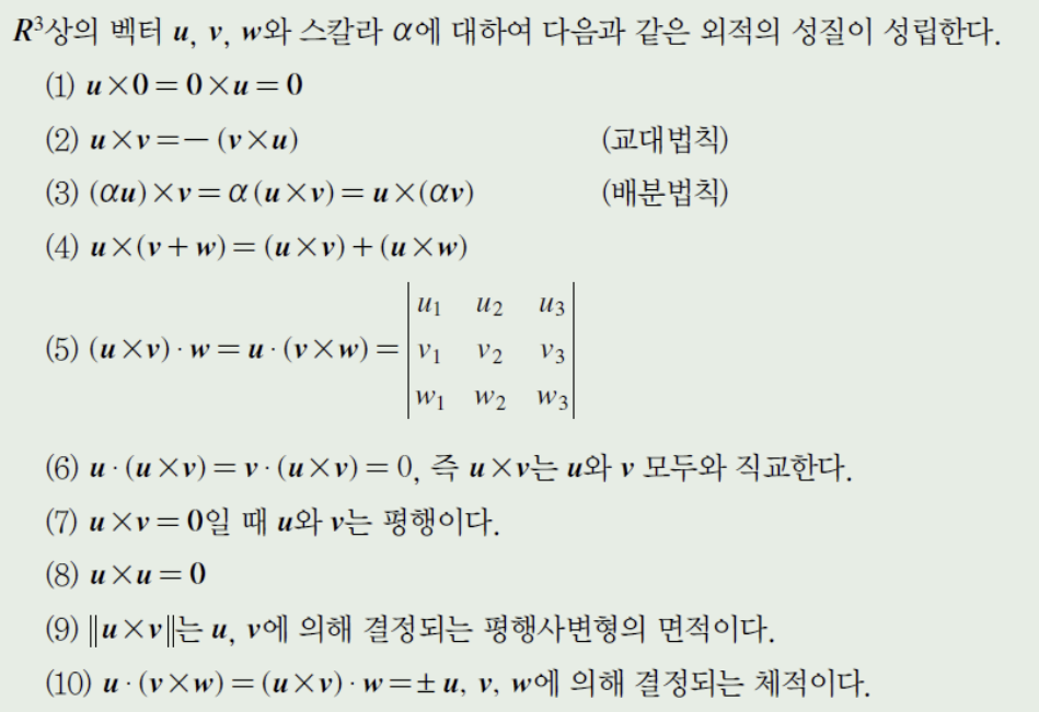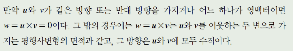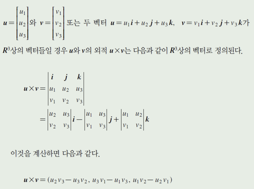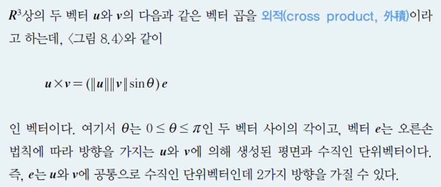 외적 : 두 벡터 u와 v의 벡터 곱인 u * v = (||u|| ||v|| sin 세타) e 를 말한다.